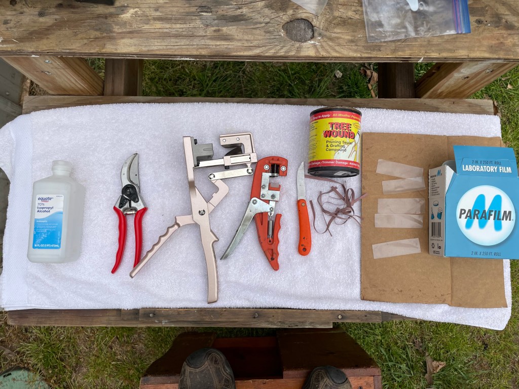 1. Get the essential tools: good quality snips, grafting tools for V grafts, grafting knife. (We purchase most of ours off Amazon) Keep all tools sanitary by cleaning often with alcohol. We keep a supply of cotton balls with our tools for this purpose, and clean before each use, and again after grafting 25 or more trees.